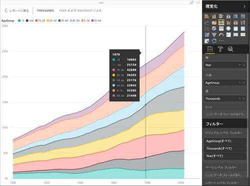 ggplot2で折れ線グラフを作成した時と、同じデータセットを使って、 Power BIで、どのような折れ線グラフが作れるかを試します。 mukkujohn.hatenablog.com 積み上げ面グラフ こちらのデータセットを使います。 > head(uspopage) Year AgeGroup Thousands 1 …